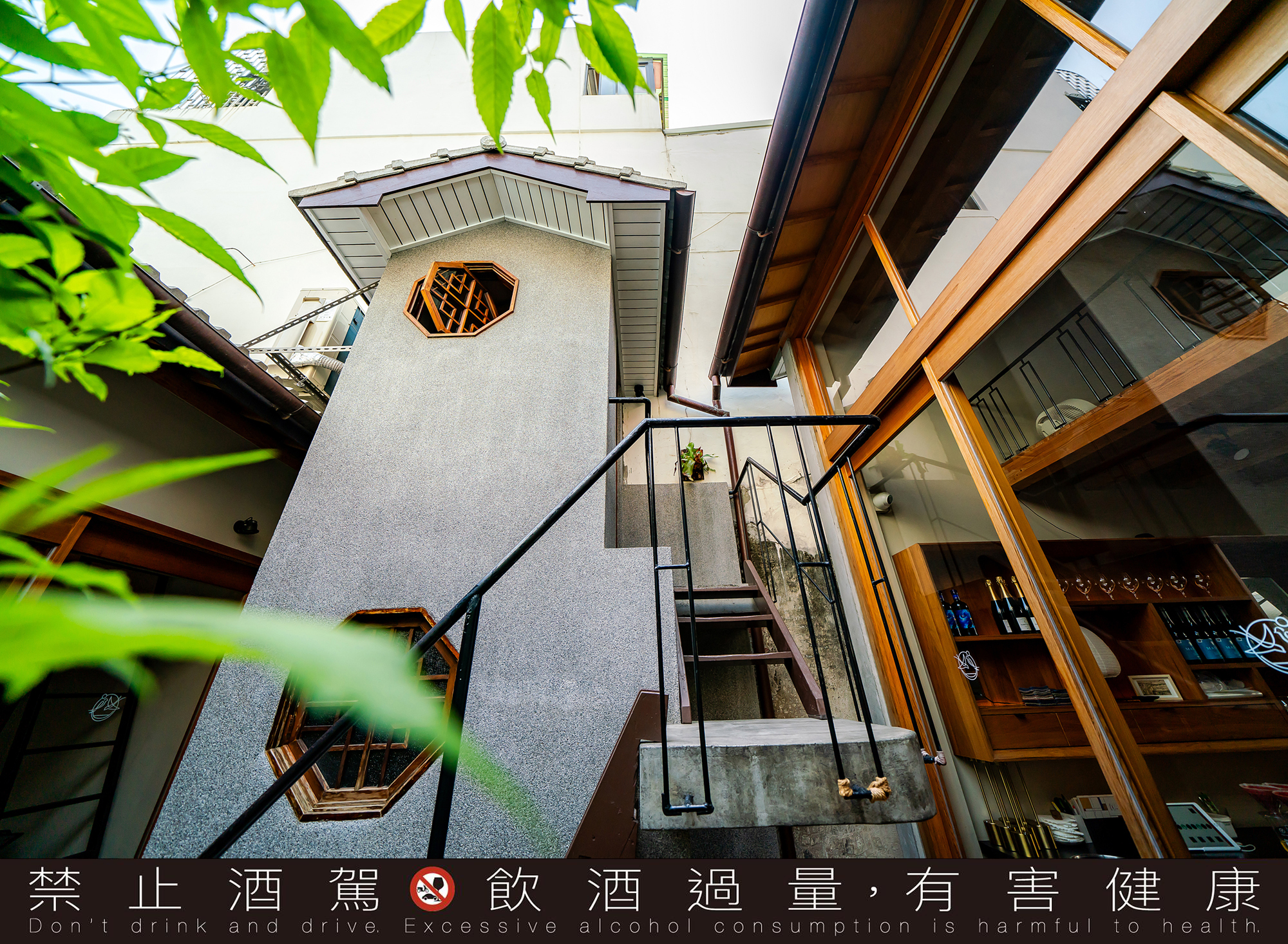 Swallow進駐的百年宅邸,保留傳統「二進一過水」的建築形式,溫潤的木作與復古的海棠窗花,烘托出了老宅的典雅氣質;連結前後兩棟的天井,加上大片落地窗,充份的天光,一掃許多酒吧的昏暗;天井中的一棵水蜜桃樹,則是來自恩師王靈安的相贈。