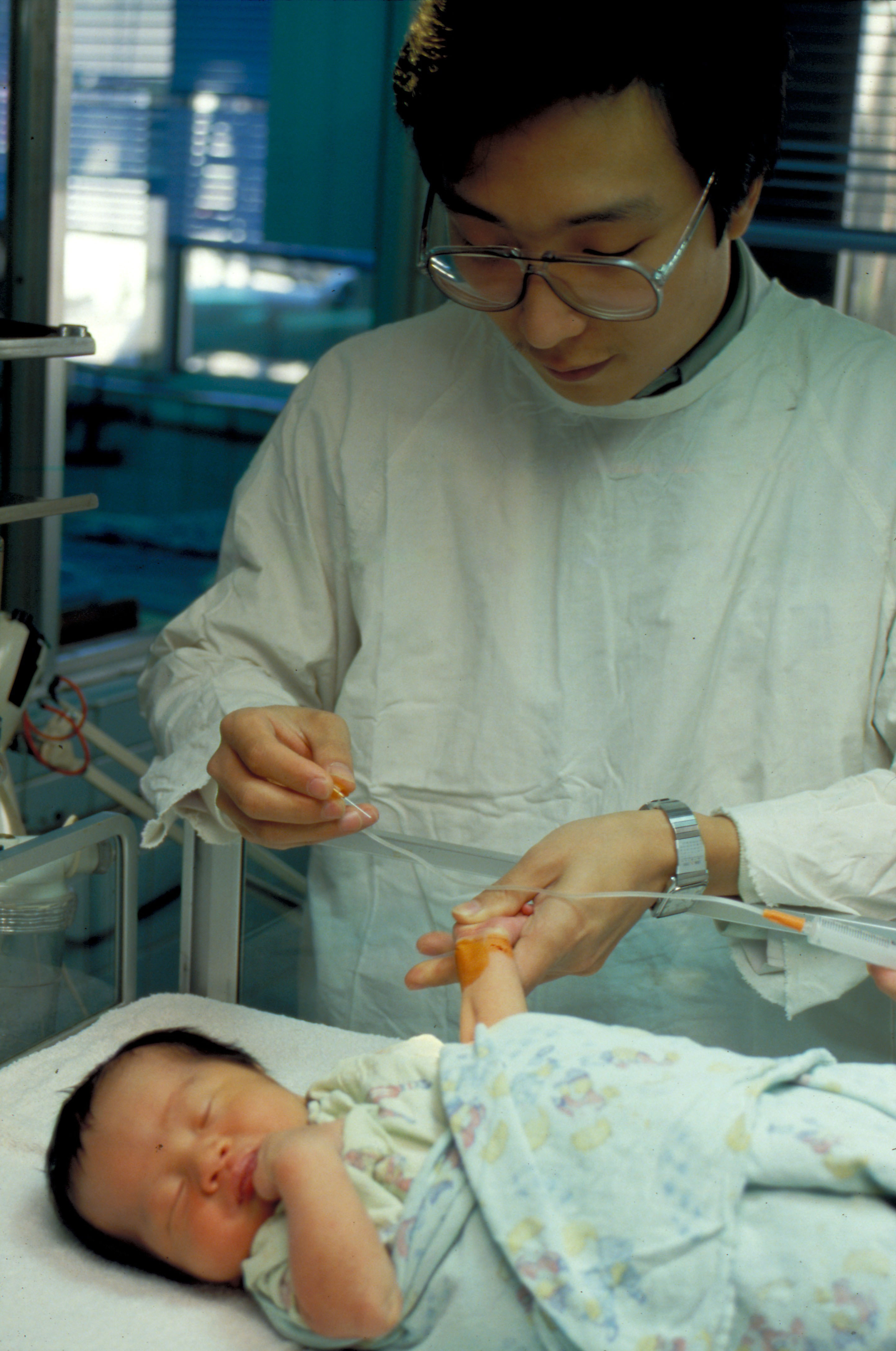 國防醫學院的同學至所屬的教學醫院三總實習,這位準大夫正在為新生兒做動脈抽血。(傅君/鐘永和)