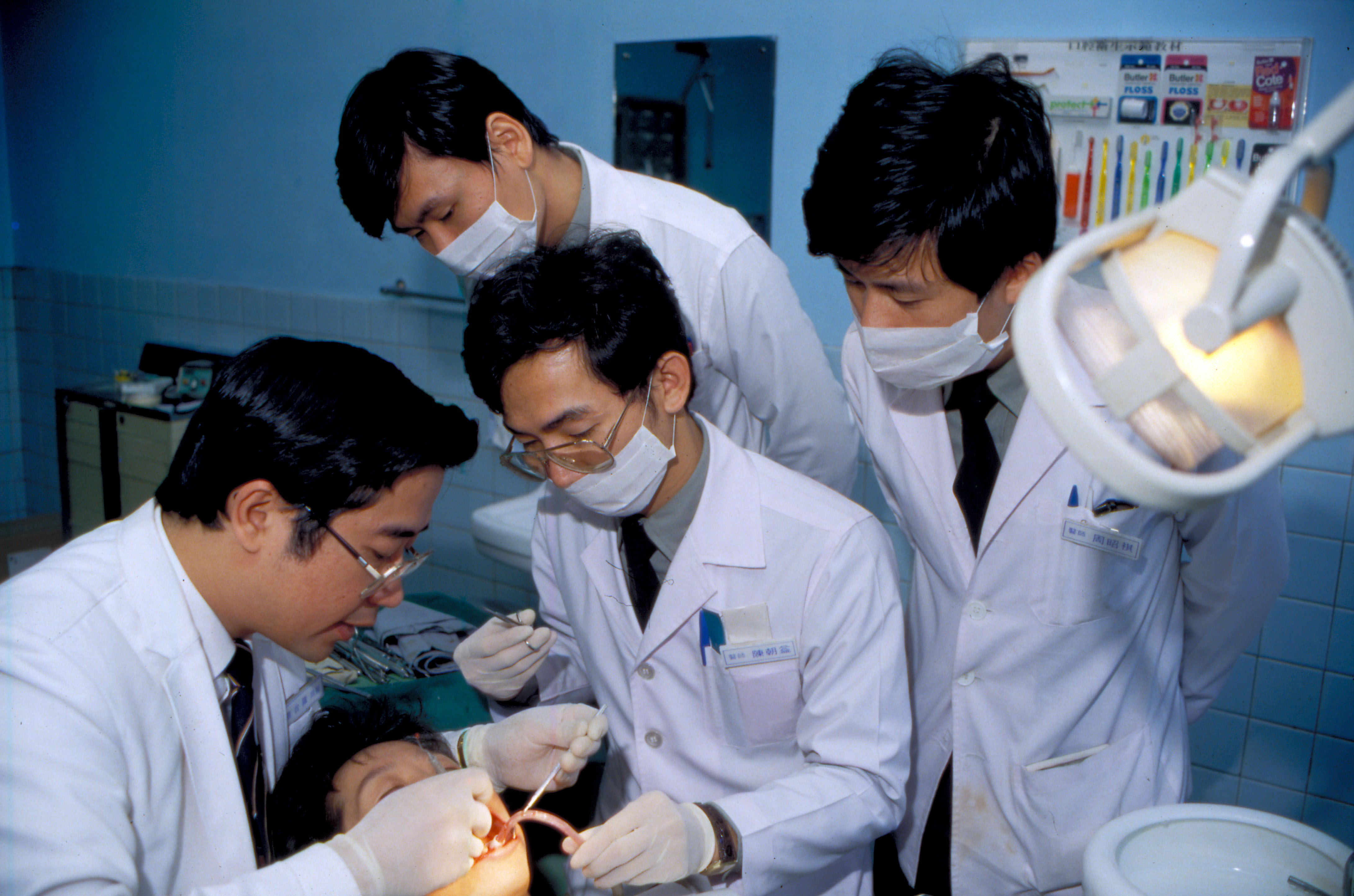 牙醫系學生專注地協助教官開刀,邊做邊學。(傅君/鐘永和)