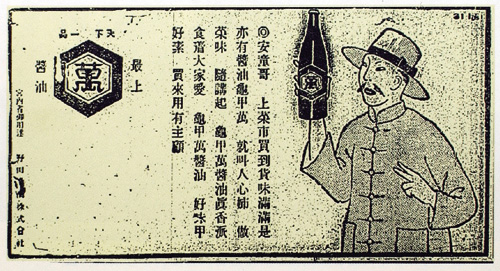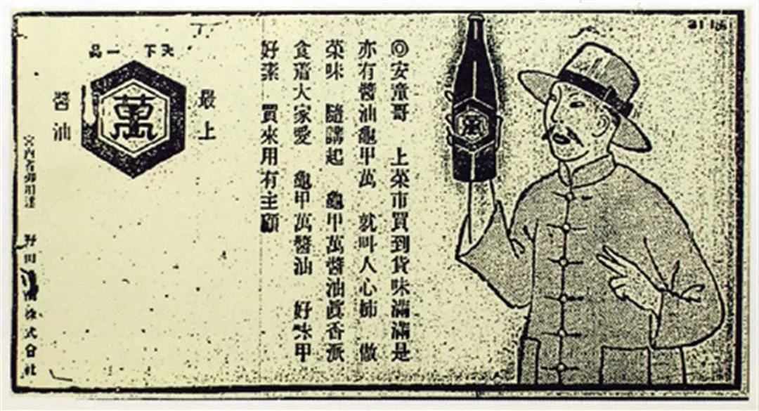1931年的龜甲萬醬油廣告,改編台灣傳統唸歌〈安童哥買菜〉之歌詞並借用其意象。