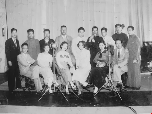 (右)日據時期曲盤錄製都需到日本,圖為古倫美亞唱片歌仔戲前後場人員攝於出發前夕。前排右起第3及第4位為唱片名伶純純與愛愛,前排右1為〈農村曲〉作曲者蘇桐。(蘇明聰提供,鄭恆隆攝)下列唱盤(僅顯示標籤)為林太崴提供。
