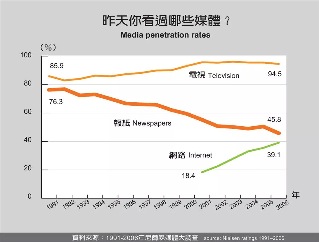 昨天你看過哪些媒體?資料來源:1991-2006年尼爾森媒體大調查