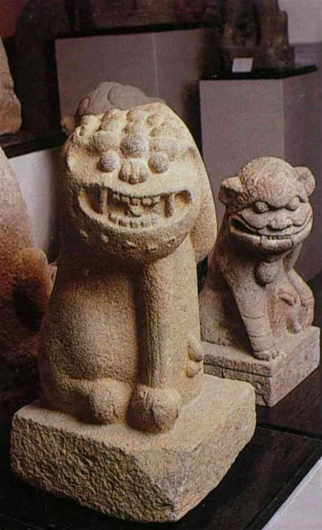 中國老祖先辟邪制煞的厭勝物裡,石獅數量也就排了第一名,早期是保護帝王墳的巨型鎮墓獅,唐朝與西亞來往頻繁,石獅造型走向寫實;元朝時,加上「外族」元素,鬃毛一圈圈的「螺獅紋」出現,造型似捲毛狗,一改凶猛威武而為吉祥討喜。加上人們往往依著最親近、最易見到的動物想像猛獅模樣,舞獅的動作姿態就有「北獅像狗、南獅像貓」的說法;至於石獅,自然更是任各地發揮,以狗比獅,狗有千百種面貌,獅子也就有千百種,歷史學家林衡道就曾說:台灣巨宅大廟前的石獅子,活脫就是北京狗。