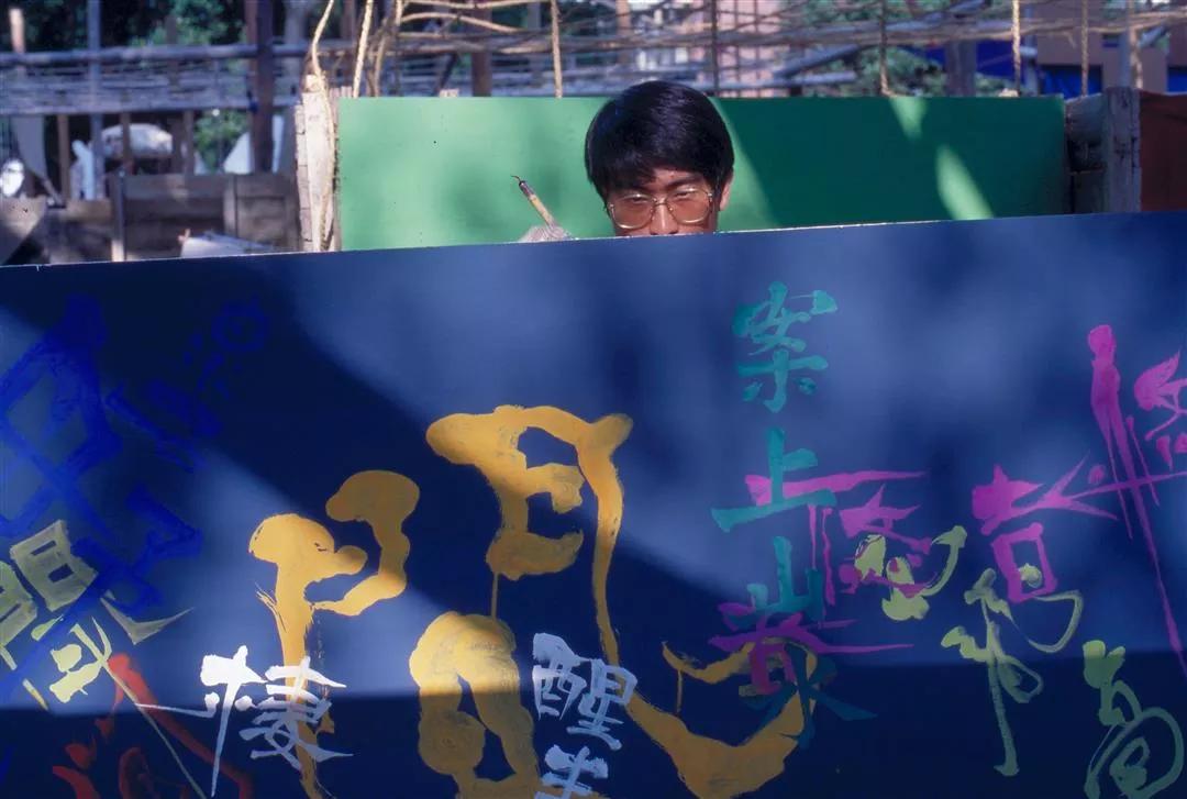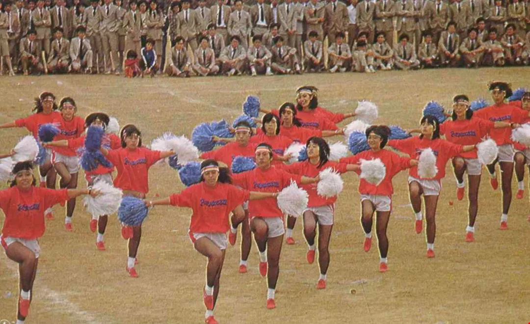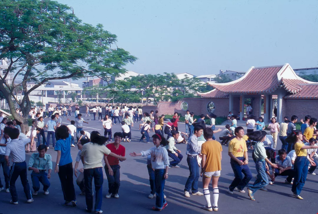 2. Students participating in a folkdance routine in front of the University's Hsuehszu Park.