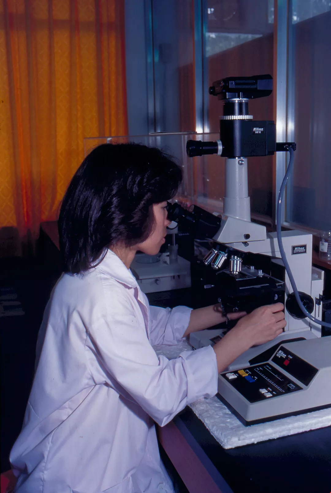 2. Assistant professor Hu T'ai-li, of the Department of Environmental Science uses advanced micro-photographic equipment to analyze the structure of micro-organisms.
