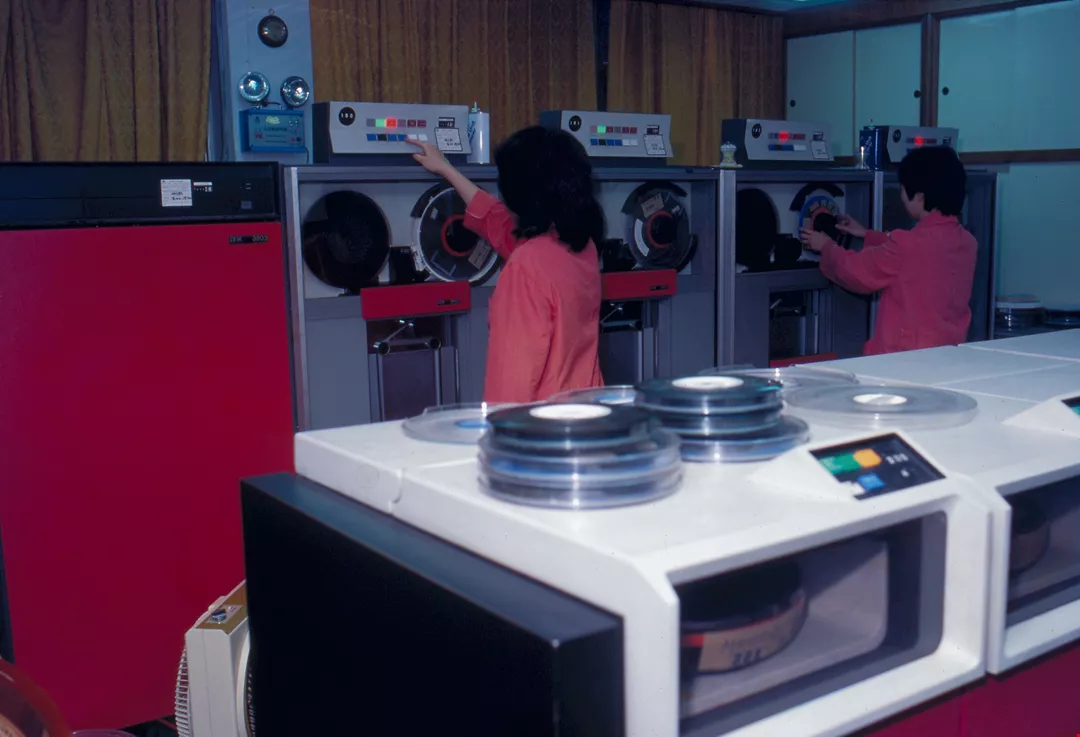 3. The University boasts the most up-to-date technology. Pictured are technicians installing magnetic disks into the electronic calculating system.