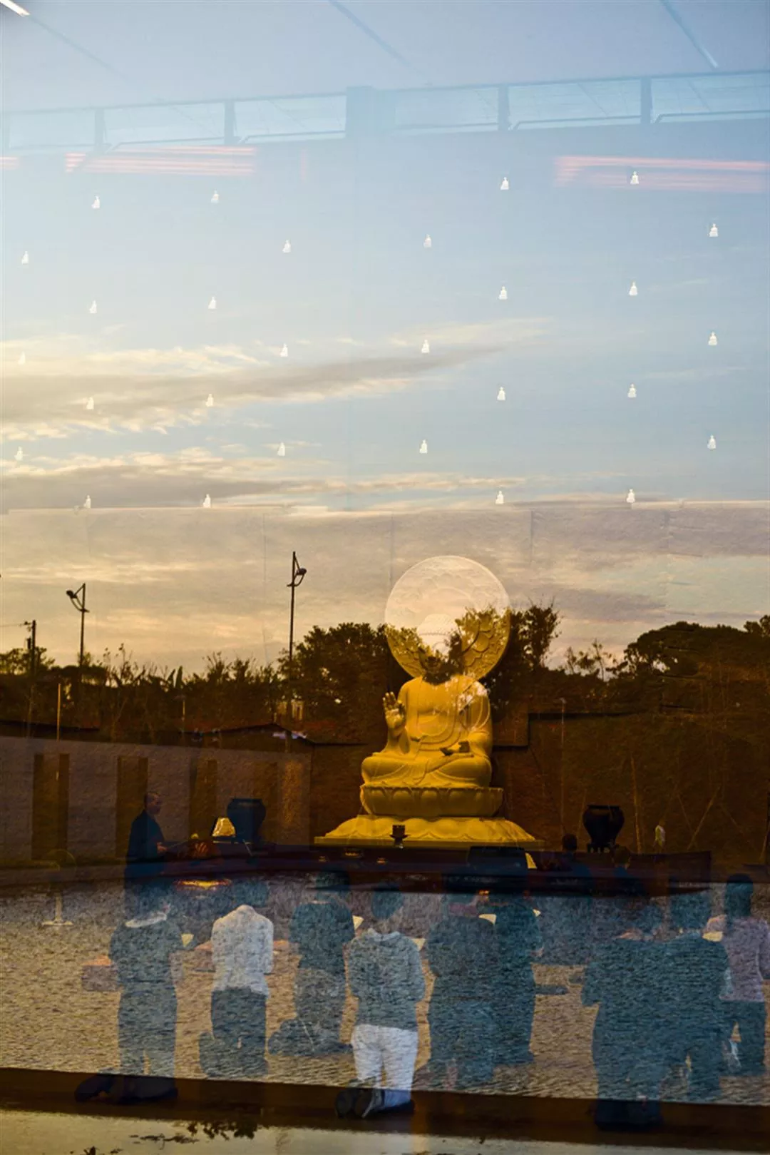 The transformations of light in the main hall of the Water-Moon Dharma Center illustrate the Buddhist concept of the immateriality of things.