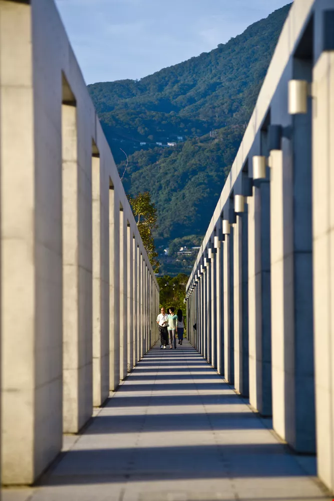 A colonnade in fair-faced concrete leads visitors into the Dharma Center.