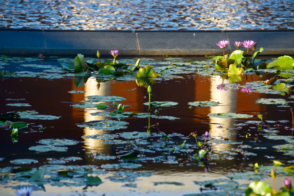 The Water-Moon Pool reflects images of the main hall’s columns, blurring the line between illusion and reality.