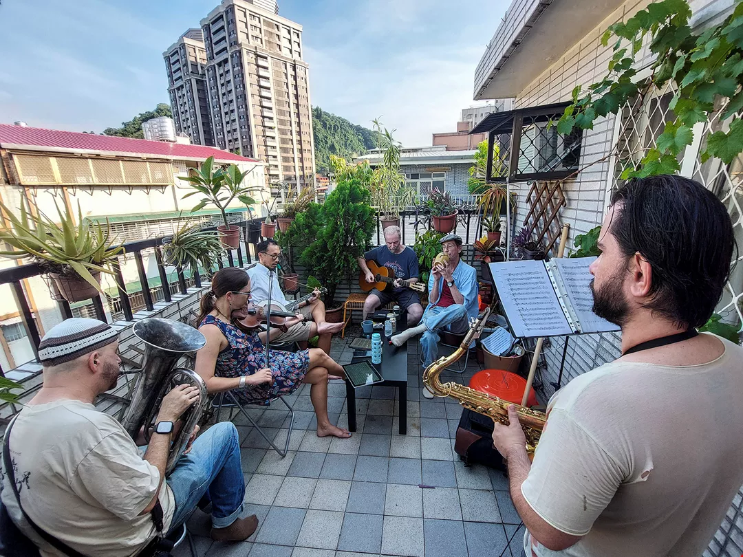 David, whose first language is English, took on the challenge of singing in Taiwanese, changing the word for foxtrot in the lyrics to the word for swing. Meanwhile, Zach on saxophone and Cristina on violin sometimes perform with their child watching from a baby carriage. Conor plays harmonica, TC is on trumpet, and Tim scrapes a metal washboard and plays bells, while Will, a skilled tap dancer, handles the rug-cutting.