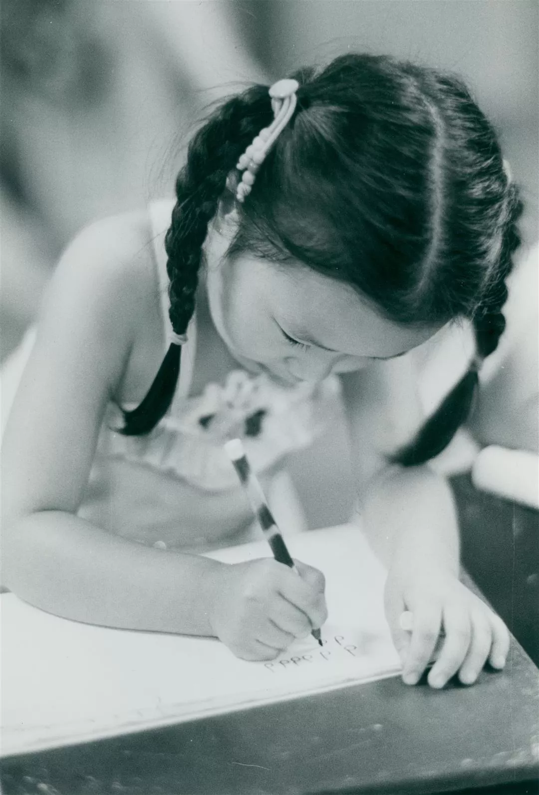 右圖:這位可愛的小妹妹用心地學抄譜,努力描出二分音符。(艾瑟)