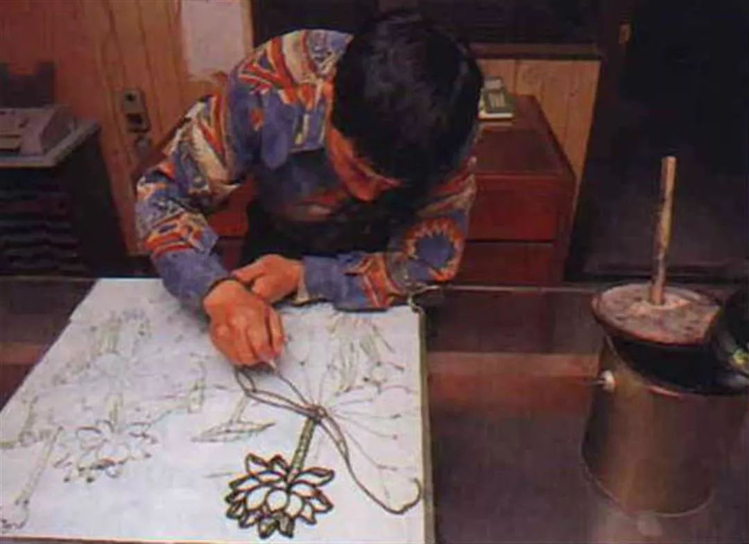 接著就要上瀝粉,材料是熬煮的水膠加上石粉所調成的膏狀物,將之裝入腳踏車內胎的橡皮管,前端接上一個圓錐形的漏斗,依照線條粗細,漏斗有著不同大小的孔隙,然後就像作蛋糕擠花一般,一邊擠出膏粉,一邊勾勒出繁複、立體的龍鳳圖案線條來。瀝粉工作完成後,接著上色。為求圖案顏色不至於太過生豔,上色講究「韻法」,也就是在色與色之間還要加上細細的白色線條,讓紅黃藍綠金這樣強烈的五色顯得協調,稱為「退暈」。