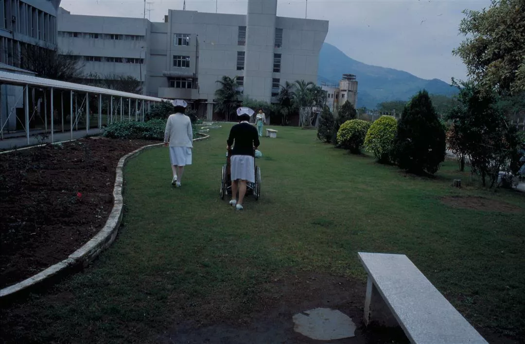 馬偕醫院的護士都受過嚴格的養成教育,對病患尤其有愛心及耐心,常陪著病患在草地上散步、聊天。(曉陽/李影/馬偕醫院提供)
