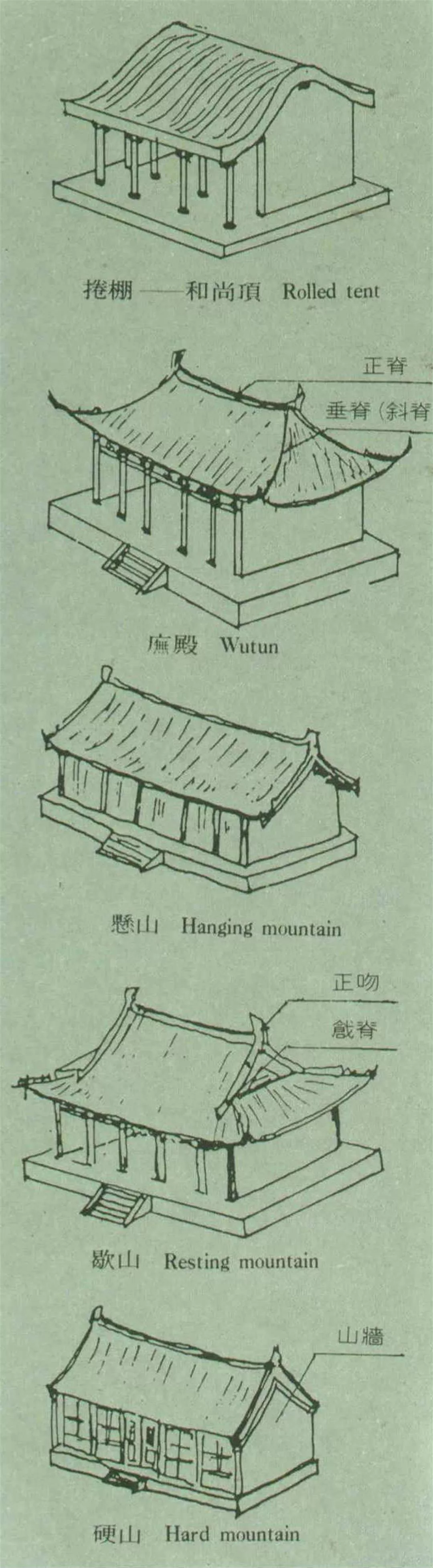 During the Ming and Ching Dynasties, rules on roof styles were strictly enforced, with the wutun holding the highest position, followed by the resting mountain, hanging and hard mountain styles. Ordinary citizens were not allowed to use the wutun and resting mountain styles at all.