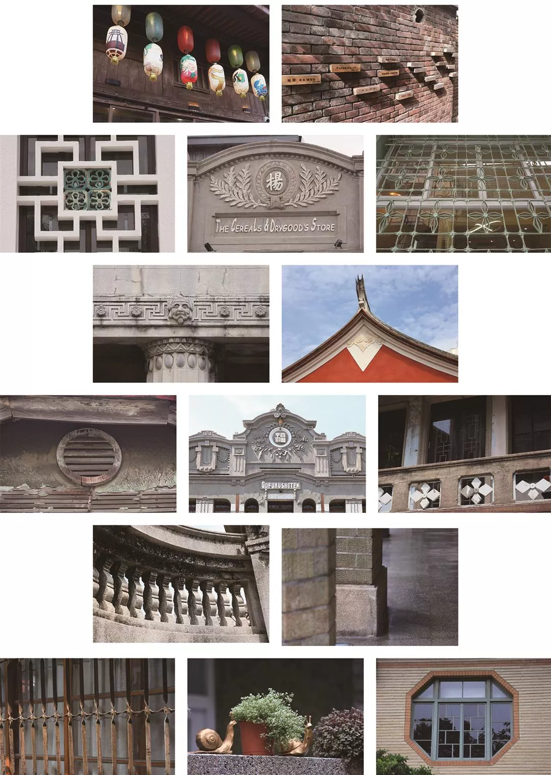 粘土彫刻、洗い出し、セメントタイル、赤レンガの壁、ツバメの尾のように反り上がった屋根「燕尾屋脊」、スクラッチタイル、人造大理石、鉄の飾り格子など、心に響く建築ディテールがこの町の面白さだ。
