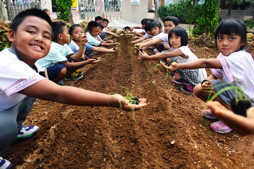 希望的幼苗扎根在土裡,也扎根在每位孩童的心裡。長榮百合國小學生在「心靈耕地」體驗種植。