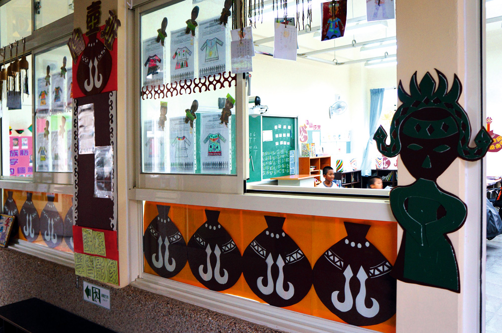 孩子們展現傳統文化與藝術學習成果,將教室布置得充滿部落風情。