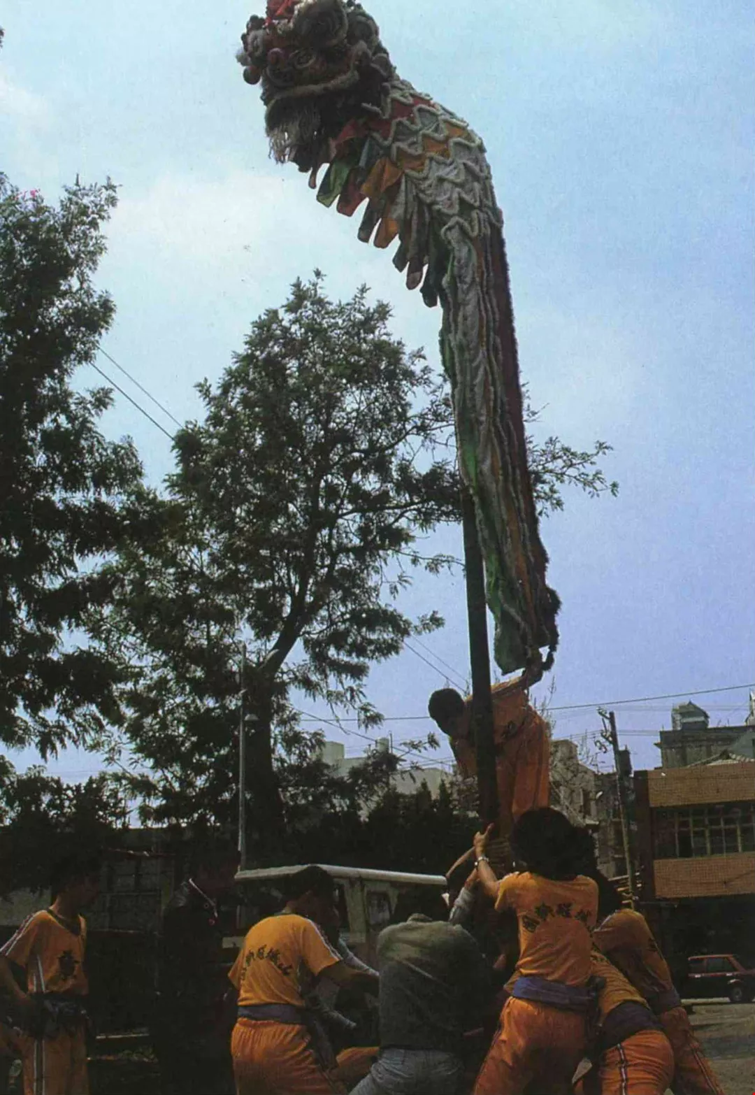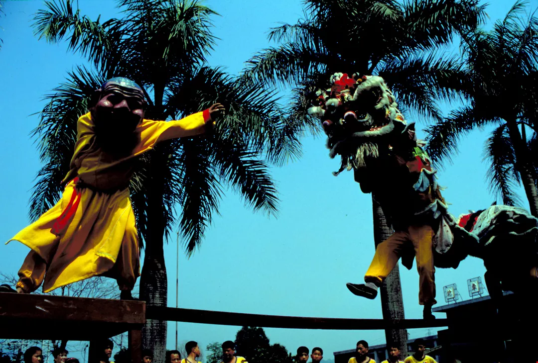 學舞獅的人往往沉迷其中,談起來就手腳並動,一發不可止。兩廣醒獅隊的邱添進,是個水泥工,他初學舞獅頭時,「常常恍恍惚惚的,就覺得自己是頭獅子」。有一回,他在三層樓高的鷹架上工作,竟把那兒當做橋,舞起「過橋」來了。