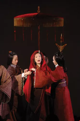 布縵隨著破曉的燈光升起,飾演漢宮妃子王昭君的王心心,穿著一襲特別由日本「能劇」服裝大師前田文子所設計的滾黑邊正紅寬衫現身;即將受命嫁入番邦的昭君,正面臨犧牲自己幸福以換取國族安全的悲劇時刻。
