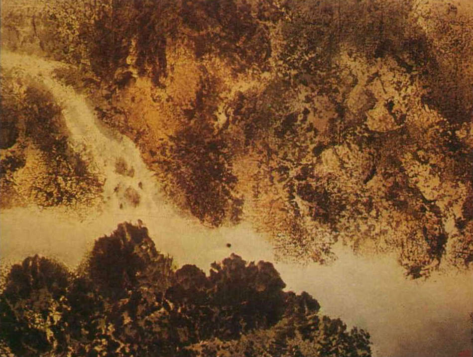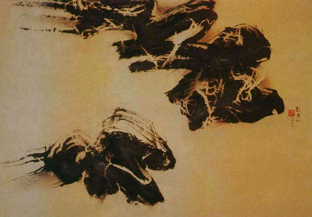 答:就因為我覺得只在用筆用墨上求新求變,終究是「小腳放大腳」,走不了多遠。我追求的是國畫的徹底革新。說也可憐,有半年多的時間,我丟開毛筆,改用毛刷、草刷、蓮蓬、樹皮來作畫;又跑遍了台北的大小紙廠,收集各種不同的紙來試驗。在方法上,我不僅「畫(寫)」,還把墨塗在各種東西上,再「拓印」到紙上,要不就讓墨從上面的紙背「滲印」到下面的畫紙上……。總之,是想看看能不能創造出單用筆所不能達到的效果。結果還不錯,有時是自己控制的、有時是碰巧,常常能製造出筆畫不出來的感覺,我稱這個方法為「拓墨」。