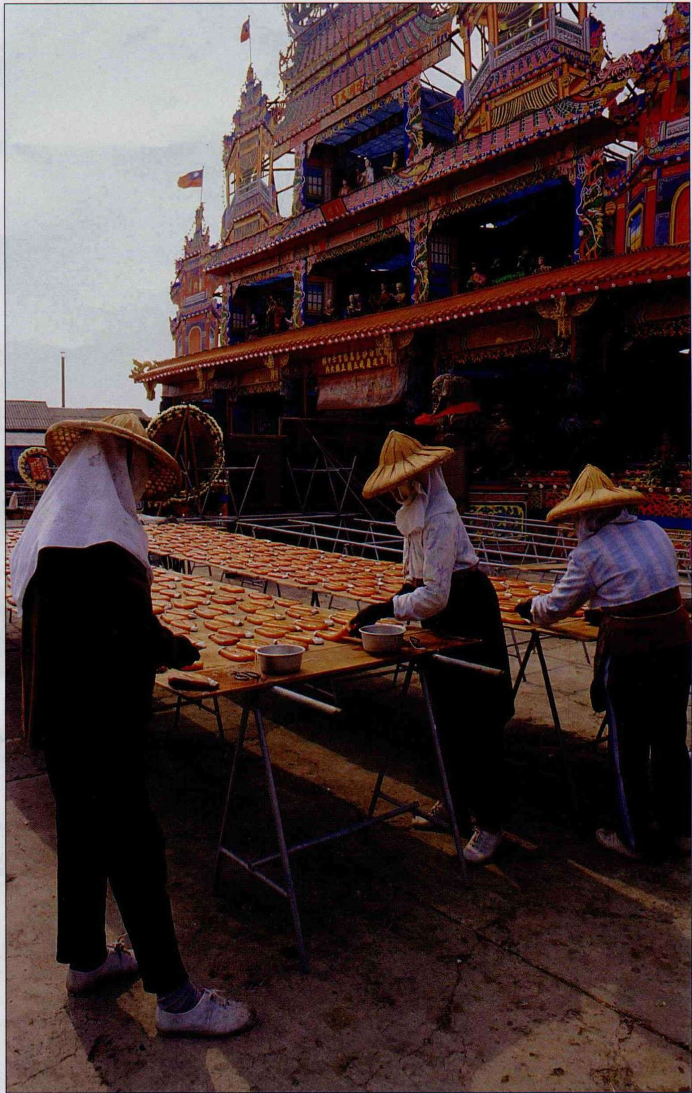 茄定鄉白砂崙剛好在烏魚產期做醮,晾曬在廣場的烏魚子與做醮牌樓相互輝映,原本台幣三百來塊的生烏魚卵巢經加工,價錢一下子提高三倍。
