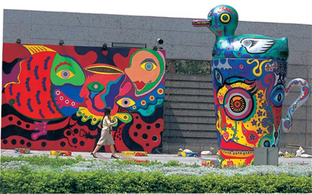 從匆忙中找回自在,用空間趣味找回人性。圖為台北街頭的公共藝術。