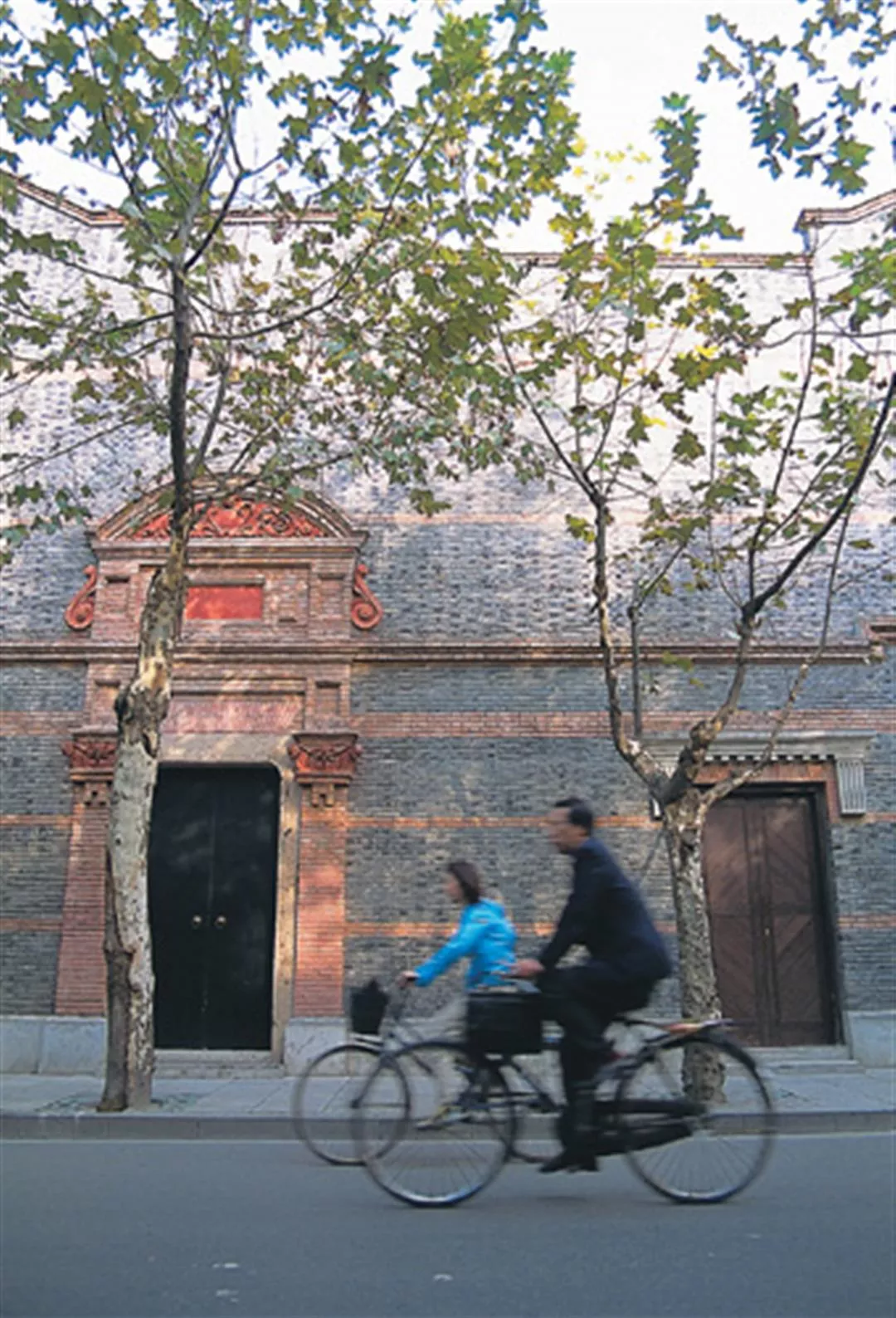 上海市民騎車經過石庫門。石庫門的建築風味,並未因為「新天地」開發而破壞,城市舊貌的保持與開發需求獲得平衡。