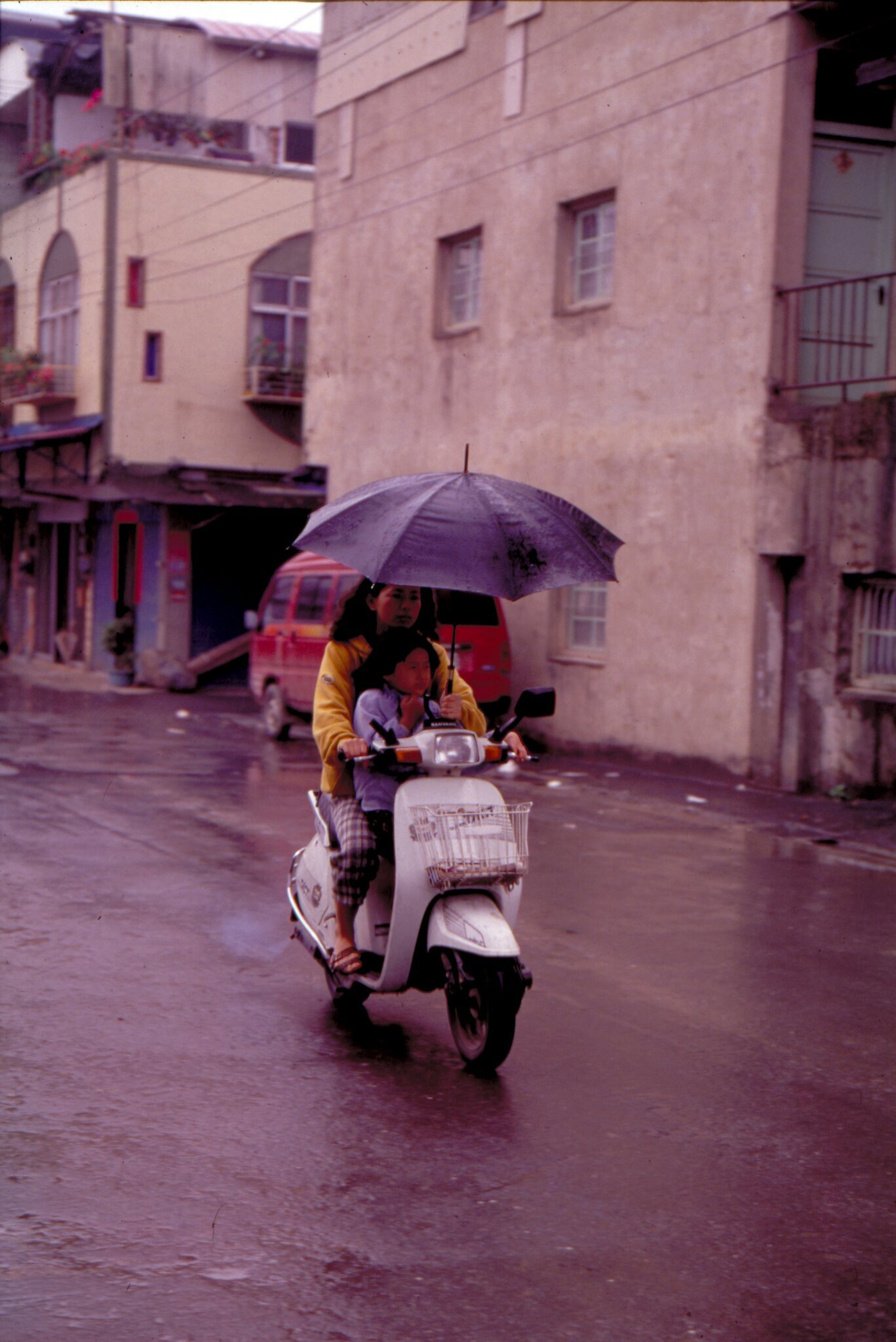 埔里風力不強、路上車輛又少,鎮民都練就「撐傘騎機車」的身手。(張良綱)