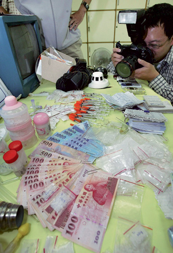 查獲吸毒案的晚上,北縣一所警局裡陳列著查獲的金錢與和針頭等犯具。在基層員警心的認知中,擁有針頭等同於吸毒,也因此,許多毒癮者視購買針頭為畏途。