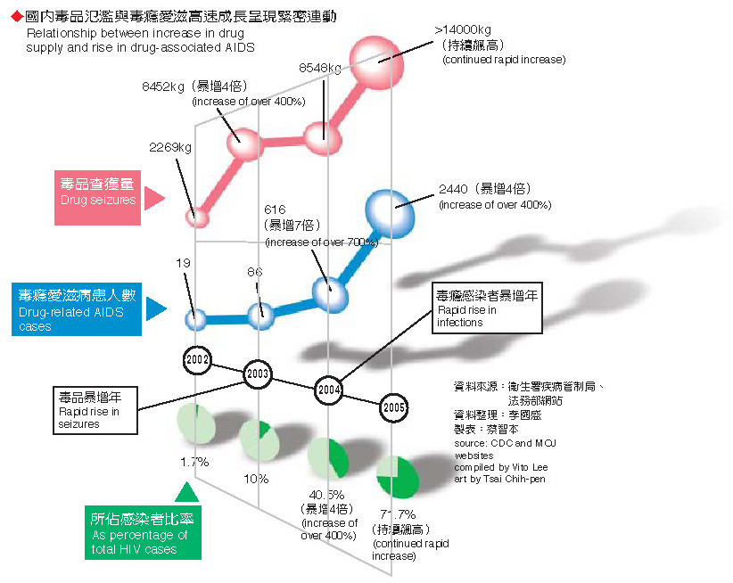 另一方面,近年國內毒品查獲量和毒癮愛滋感染者人數的成長數字也相互呼應,一前一後達到突增的高峰。2002年以前,國內每年的毒品查獲量穩定的維持在2000公斤左右,然而到了2003年,毒品查獲量卻一下子成長了4倍,達到八千多公斤,幾乎與毒癮愛滋病患陡升的時間點相同。
