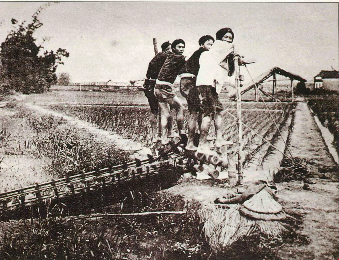 (左)台灣地多肥沃,吸引了大量的閩粵移民前來開墾。有些土地的水源在農田附近,但地勢較低時,農民便使用龍骨車,雙腳踩踏,打水灌溉。(取材自《台灣三百年》)(取材自《台灣三百年》)