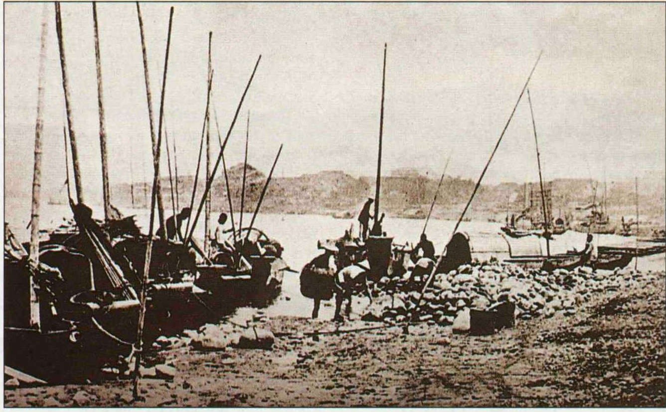 (下)清時,艋舺碼頭曾經帆檣林立,後因河水漸淺,只能停靠小型船隻。(取材自《台灣三百年》)(取材自《台灣三百年》)