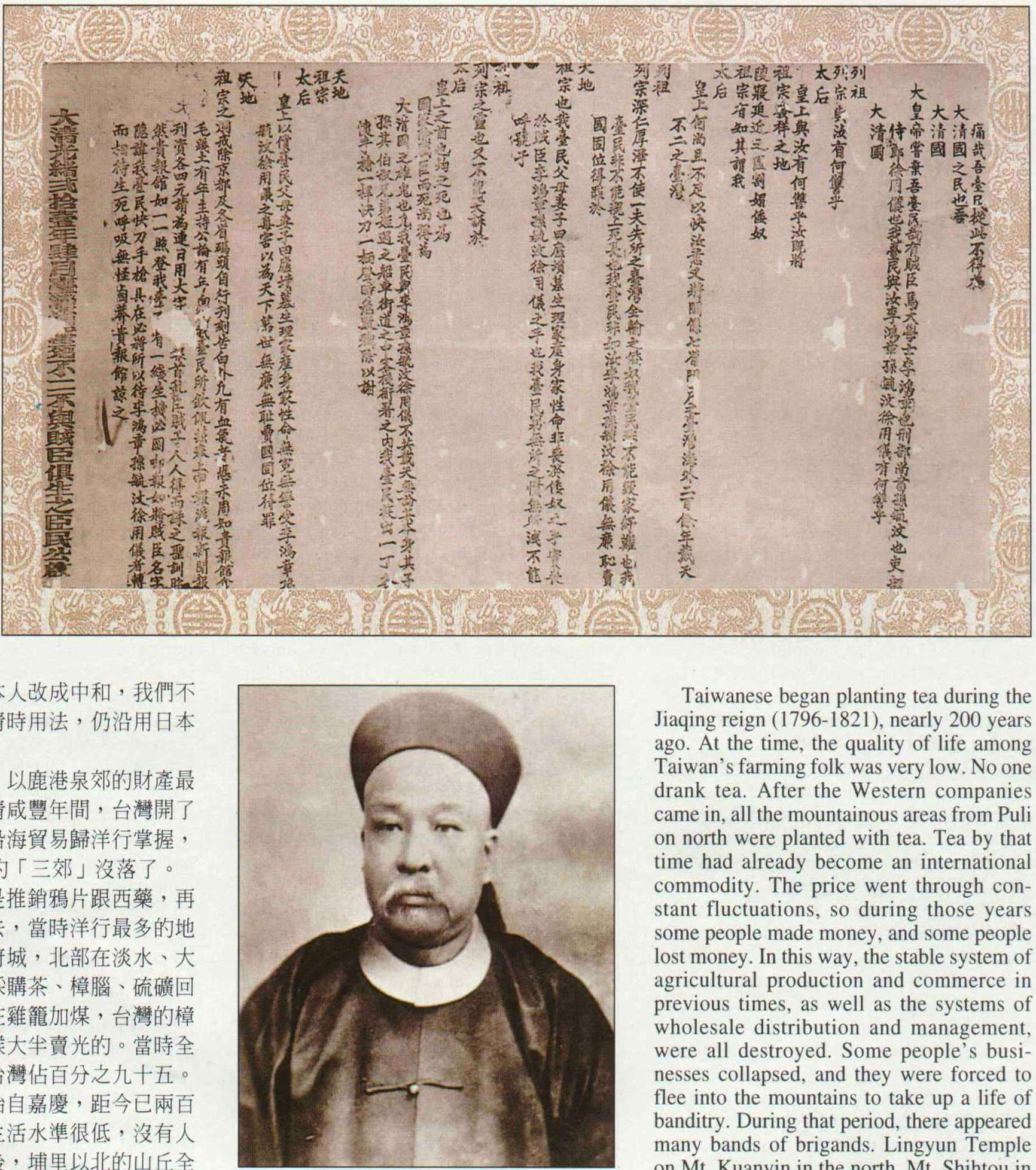 台灣人開始種茶始自嘉慶,距今已兩百年。當時台灣農民生活水準很低,沒有人喝茶,洋行進來之後,埔里以北的山丘全部種茶。當時茶是國際商品,價格起起落落,於是在那些年頭,有人賺錢,有人賠錢,這樣一來,過去穩定時期的農業生產、商業系統,批發、管理等制度被破壞了,有人生意失敗,被逼上梁山,成了土匪。當時出現很多土匪窩,如北部觀音山的凌雲寺、乃至苗栗的獅頭山等,都是土匪的巢臼。