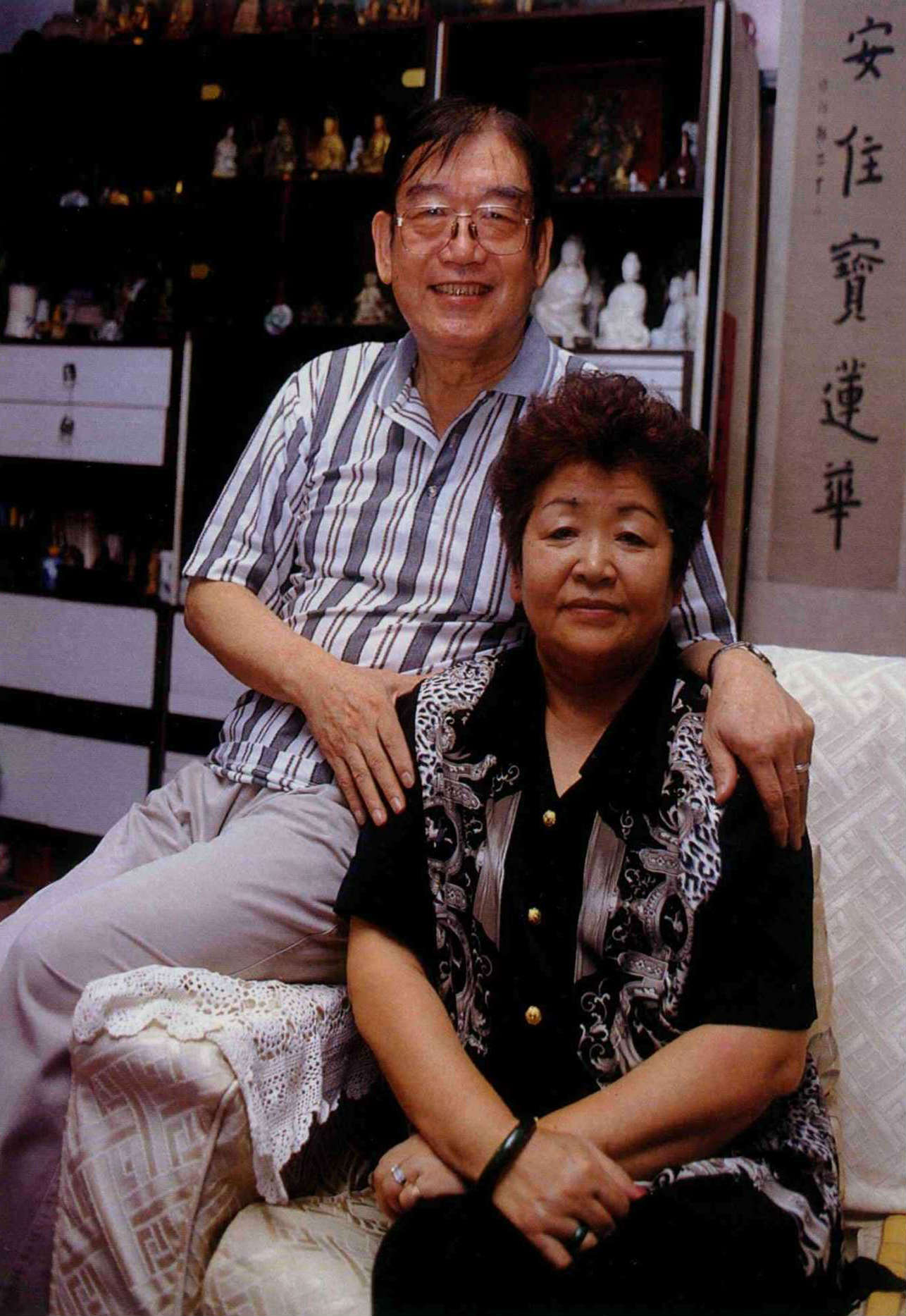 巴信誠和太太譚攸靈是山東同鄉,相互扶持半世紀而感情彌篤。圖為夫妻倆攝於滿室佛像的家中。(邱瑞金攝)
