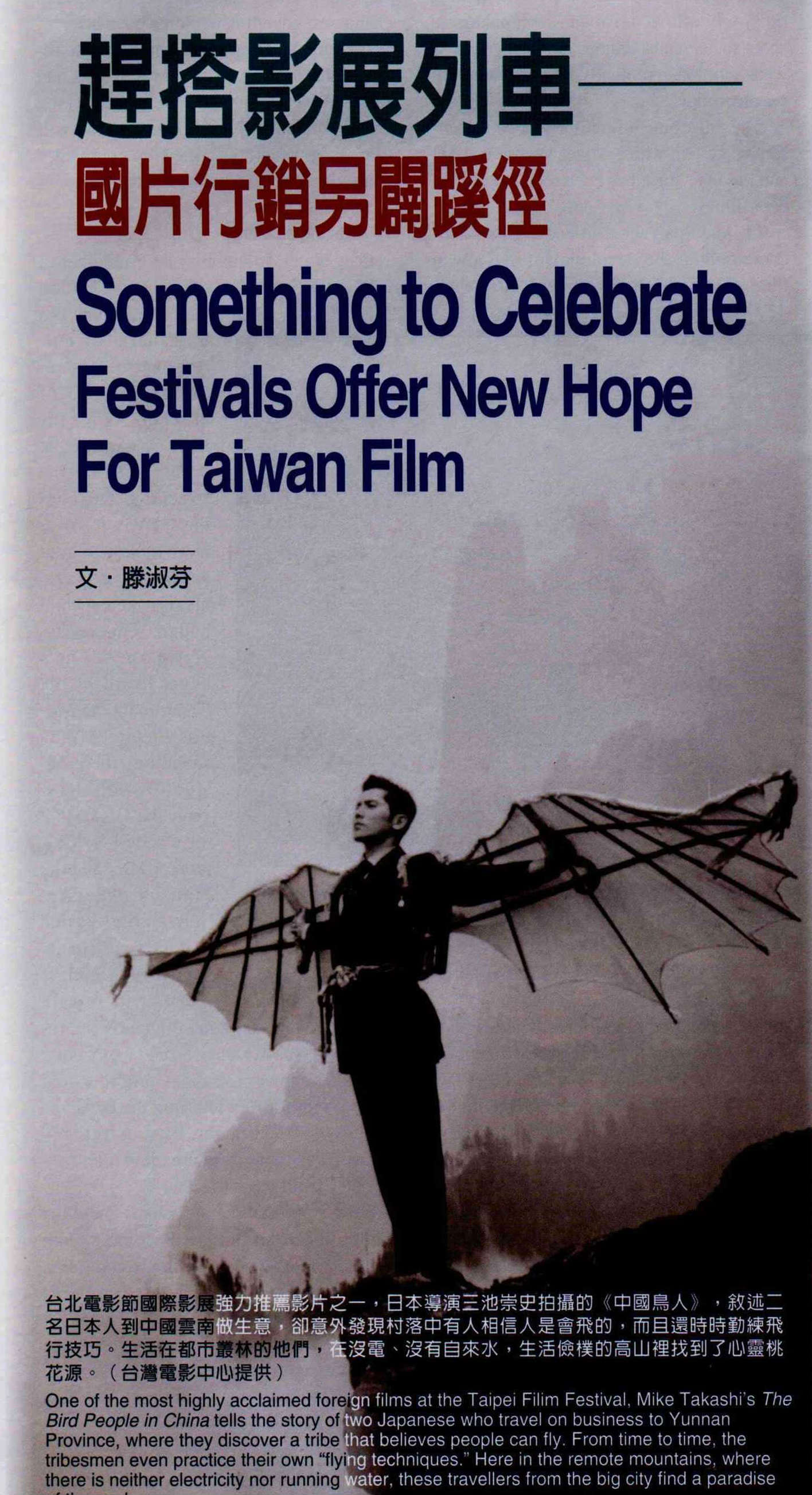 台北電影節國際影展強力推薦影片之一,日本導演三池崇史拍攝的《中國鳥人》,敘述二名日本人到中國雲南做生意,卻意外發現村落中有人相信人是會飛的,而且還時時勤練飛行技巧。生活在都市叢林的他們,在沒電、沒有自來水,生活儉樸的高山裡找到了心靈桃花源。(台灣電影中心提供)