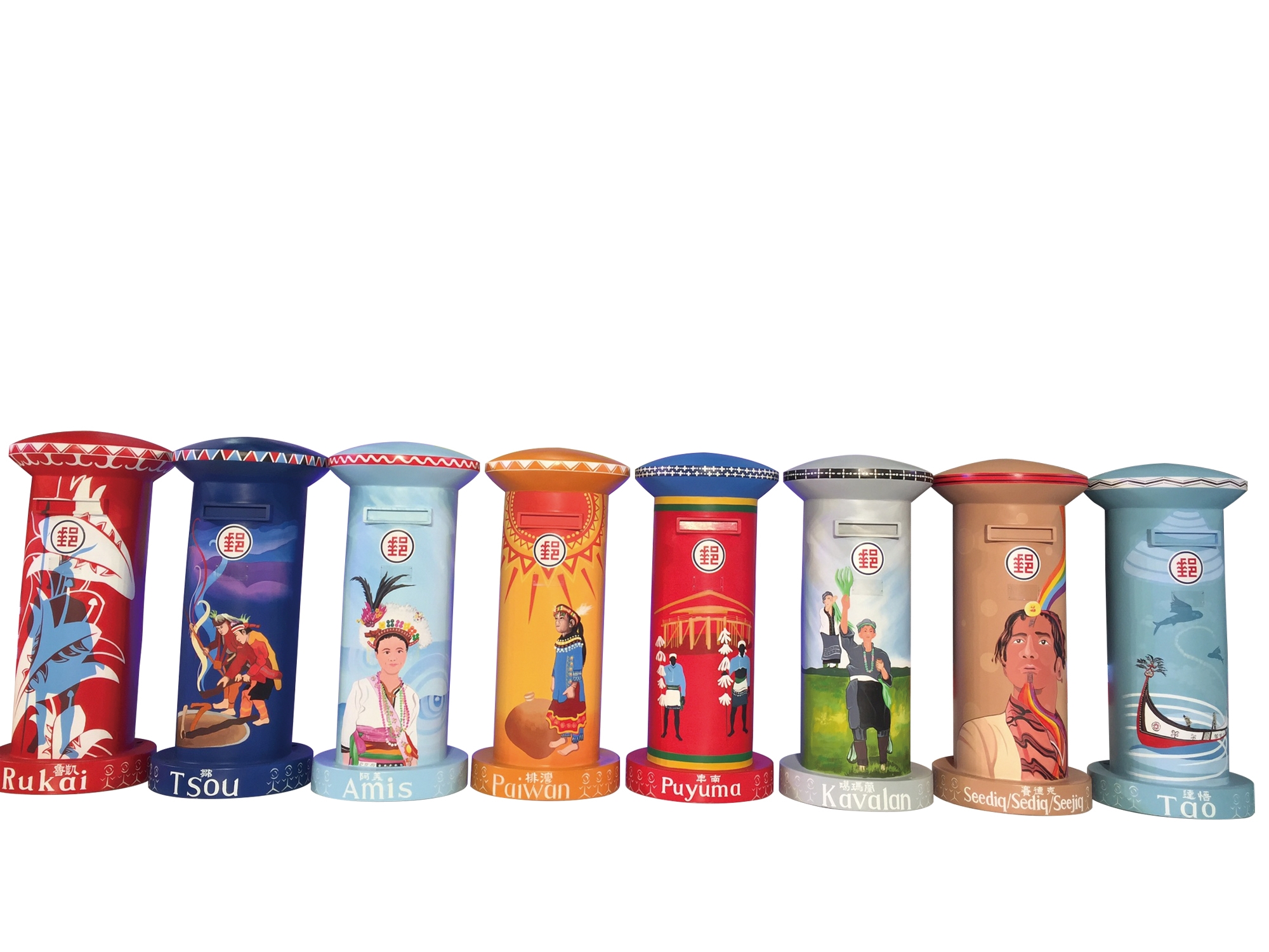 中華郵政找來原住民藝術家拉夫拉斯‧馬帝靈,依據各族的特色繪製郵筒,魯凱族的百合、達悟族的拼板舟與飛魚、鄒族的瑪雅斯比祭典等都躍上郵筒,色彩鮮豔繽紛。