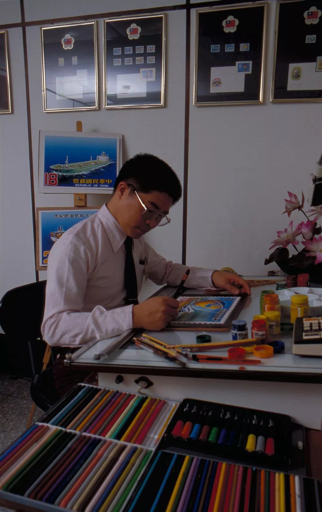 一枚郵票誕生的過程。圖1.:繪圖員一試再試,畫出郵票原圖。(本刊攝影小組)