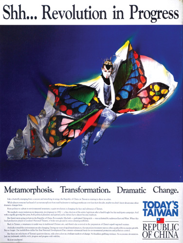 到了1990年代,國府兩蔣威權走入歷史,各種政治與社會力迸發,台灣的國家形象訴求也轉而強調「政治改革」。1993年,一幅以蝴蝶蛻變為象徵的「寧靜革命」廣告,點出了台灣民主的珍貴成就。
