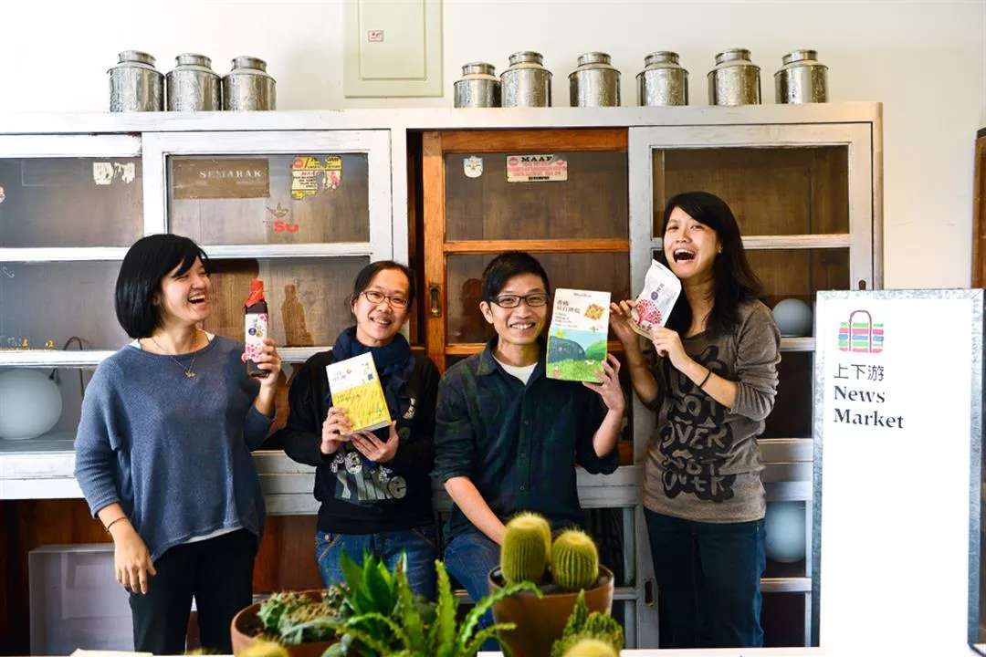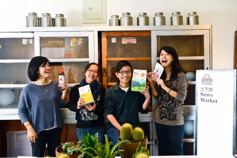 蕭名宏(右二)是《上下游新聞市集》創辦人之一,負責公司營運,該網站也和實體店面巧妙結合,販售小農產品。