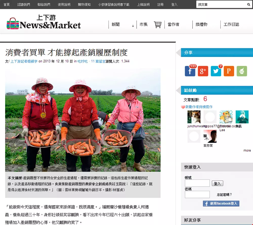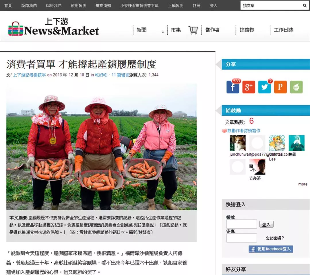 這3個概念交織出來的關係看似複雜,但因為網站建構得宜,點入主頁面後一目了然,對使用者十分友善。《上下游新聞市集》的版面設計以新聞為主,市集為輔;新聞來源分為兩類,一類是3位自聘記者、1位編輯所寫的深度報導,另一類是註冊有案、以小農為主的六百多位寫手發表的文章,也因此新聞數量呈現罕見的「季節性」現象。
