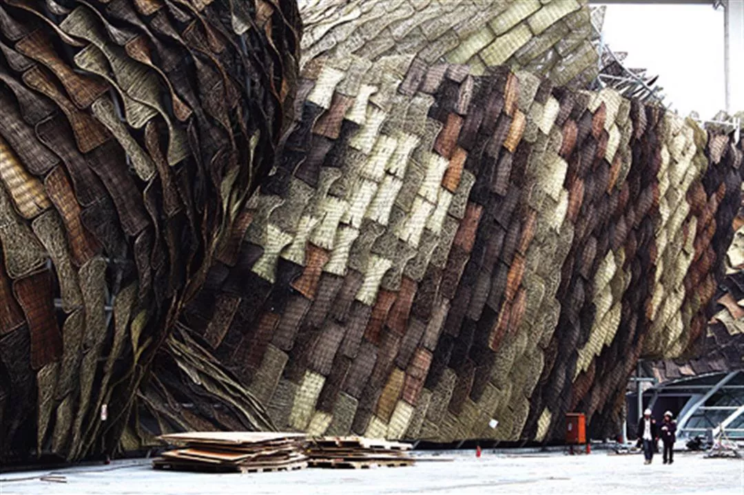 西班牙館是由8,524片手編籐板配合鋼骨結構組合而成,藤板的顏色深淺不一,乃因其浸在「柳汁廢水」中的煮沸時間不同所致。