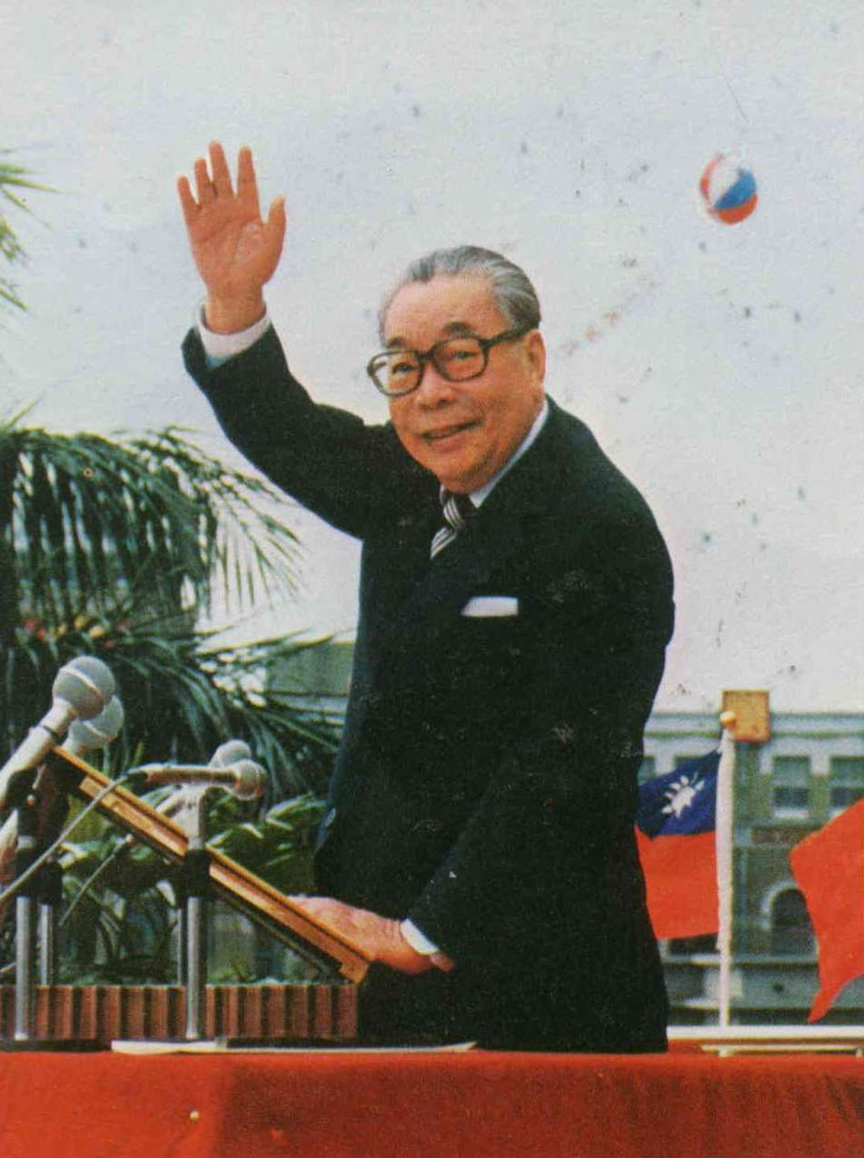 蔣總統經國先生在總統府陽台上,不斷揮手向與會人士致意,台下響起「總統好」的歡呼聲,場面溫馨熱烈。(楊永山/歐陽芷汀/鄭元慶)