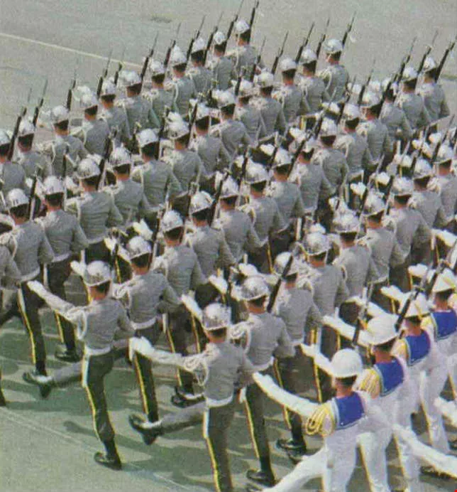 第一梯隊由三軍官校、中正預校、政戰學校、後備軍人及金馬地區代表等隊組成,表現我們堅實壯大的國防力量。