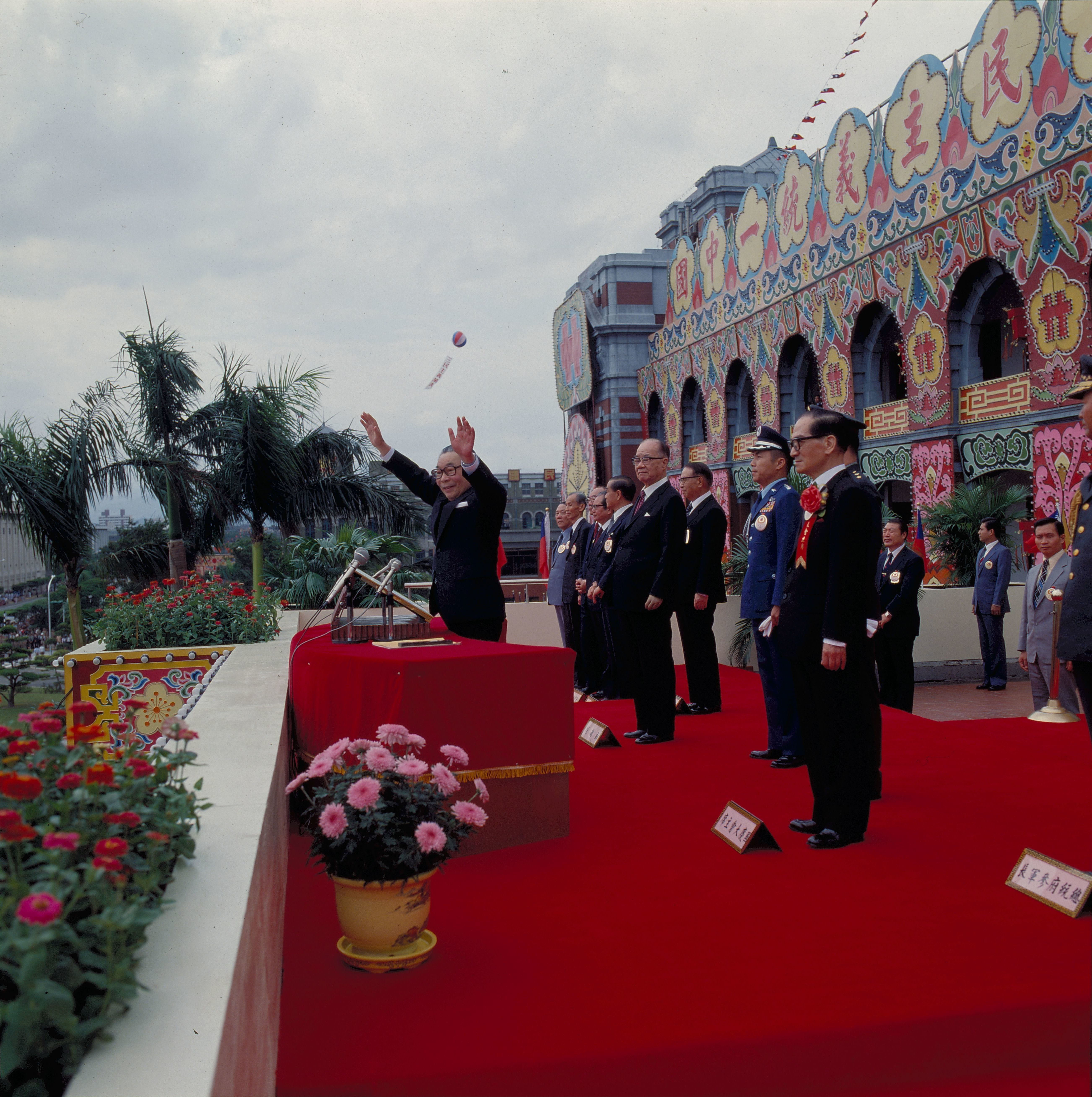 蔣總統經國先生於十時卅分出現在總統府陽台上。他一出現,在場群眾即興奮地高呼:「總統好!總統好!」總統亦親切地揮手向與會人士致意。群眾興奮的情緒於此時達到頂點,「總統好」的歡呼聲更響徹雲霄。