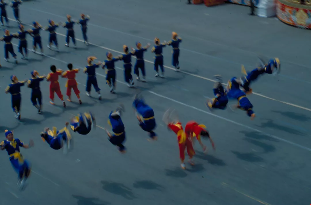 遊行時,中華民俗技藝團的團員表演翻斛斗。(楊永山/歐陽芷汀/鄭元慶)