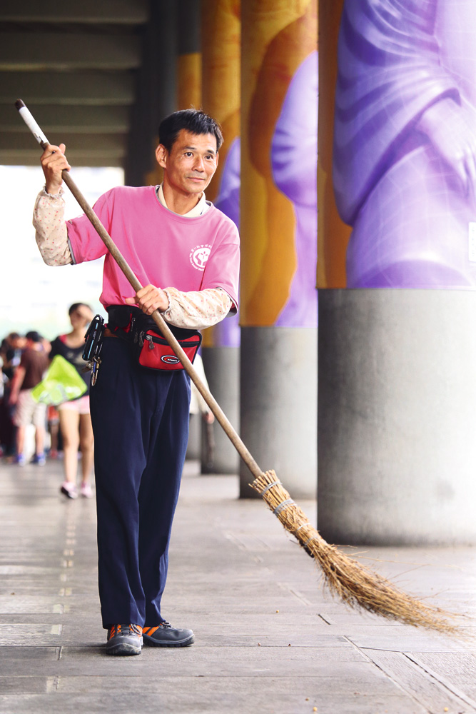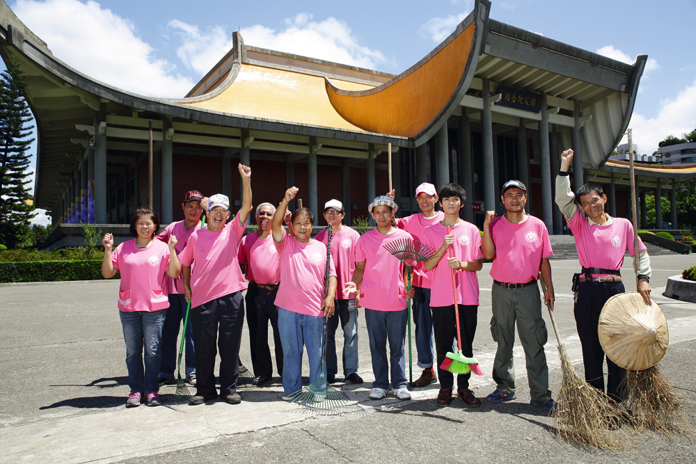 來到台北市的國父紀念館,從室內展區到戶外的大廣場,都是第一清潔的業務範圍。負責打掃紀念館兩側簷下廊道的阿亮今年已45歲,工作認真,樂於助人,除了一口稍帶含糊的口音,幾乎看不出他是一名重度智障者。