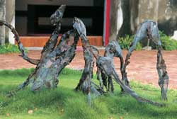 第一檔展出的《黑手打狗》,提供藍領藝術家發聲,黑手藝術家劉丁讚以機車廢五金焊接出的巨大蚊子、鐵馬等雕塑,果然讓社區的孩子們大膽觸摸,興高采烈地騎乘。
