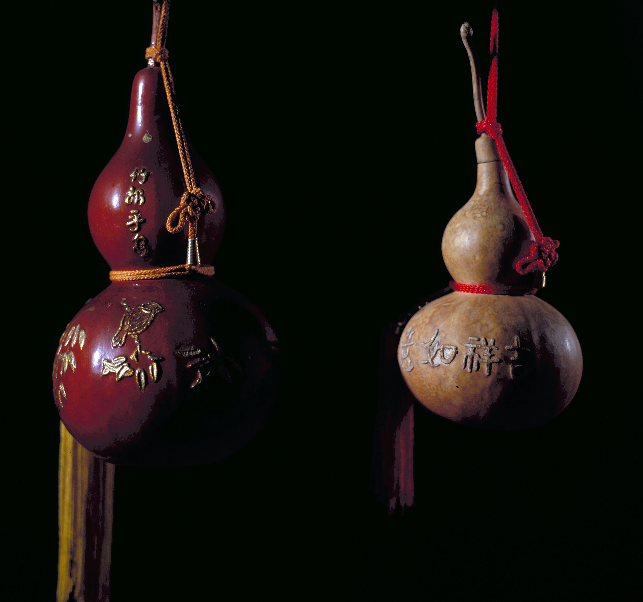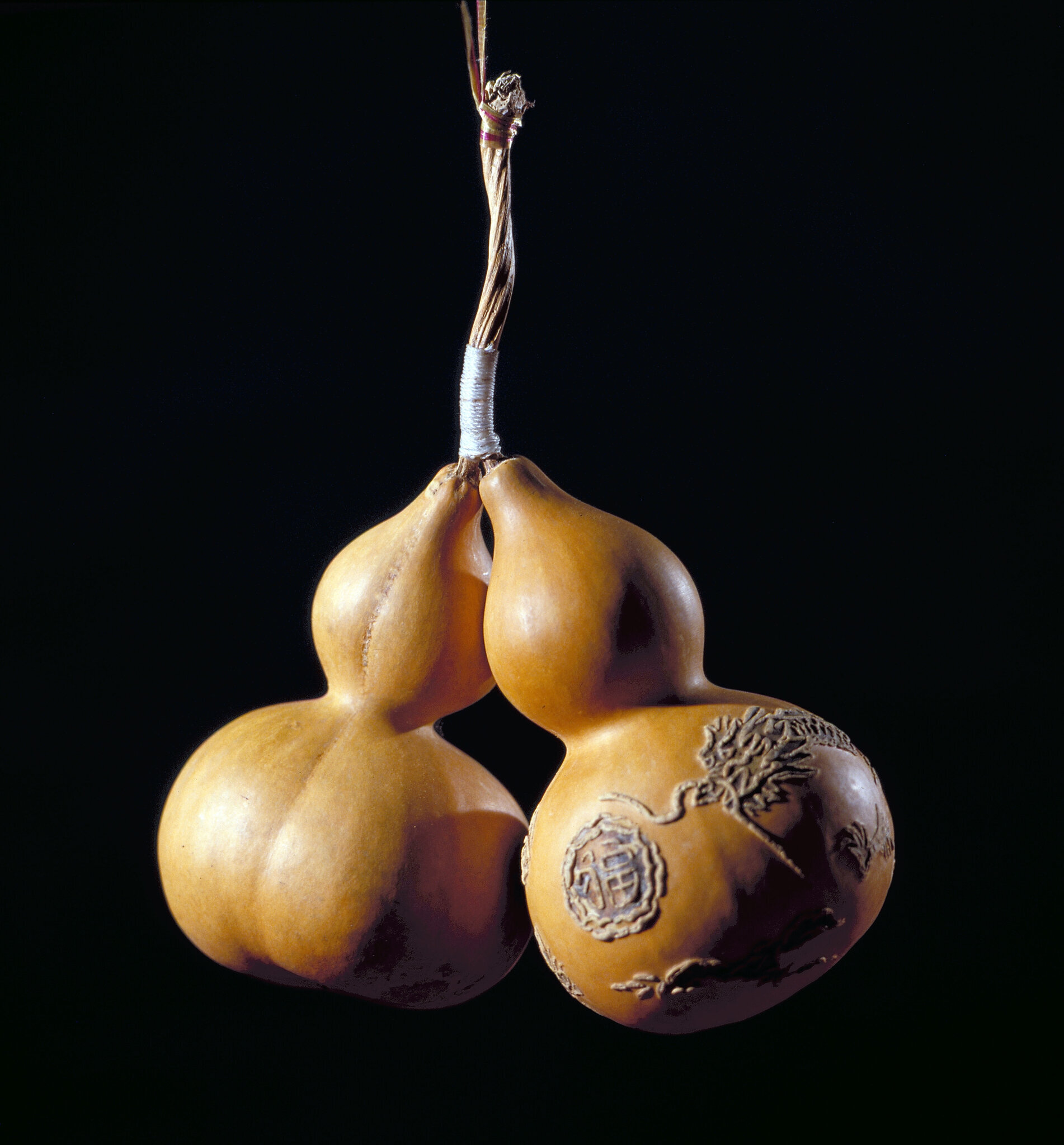 鍾盛加工的葫蘆成品中,有些刻有古色古香的圖案,最常見的是福字、壽字,和龍、鳳、松、鶴。鍾盛說:「這些圖案,要在葫蘆還小的時候,就刻在它的嫩皮上,隨著果實日漸長大,圖案的線條也會跟著凸現擴大,長大後再刻,就沒有這種效果了。」