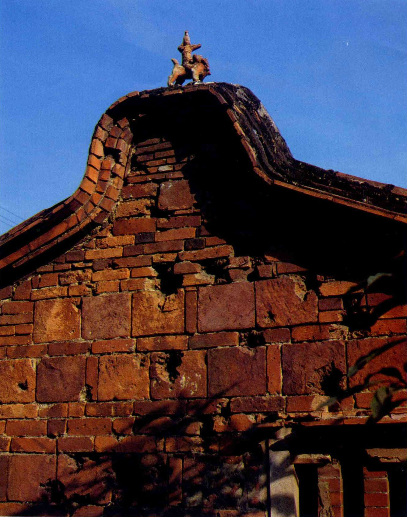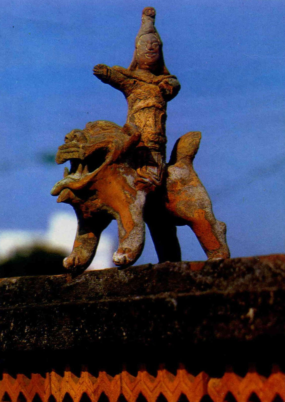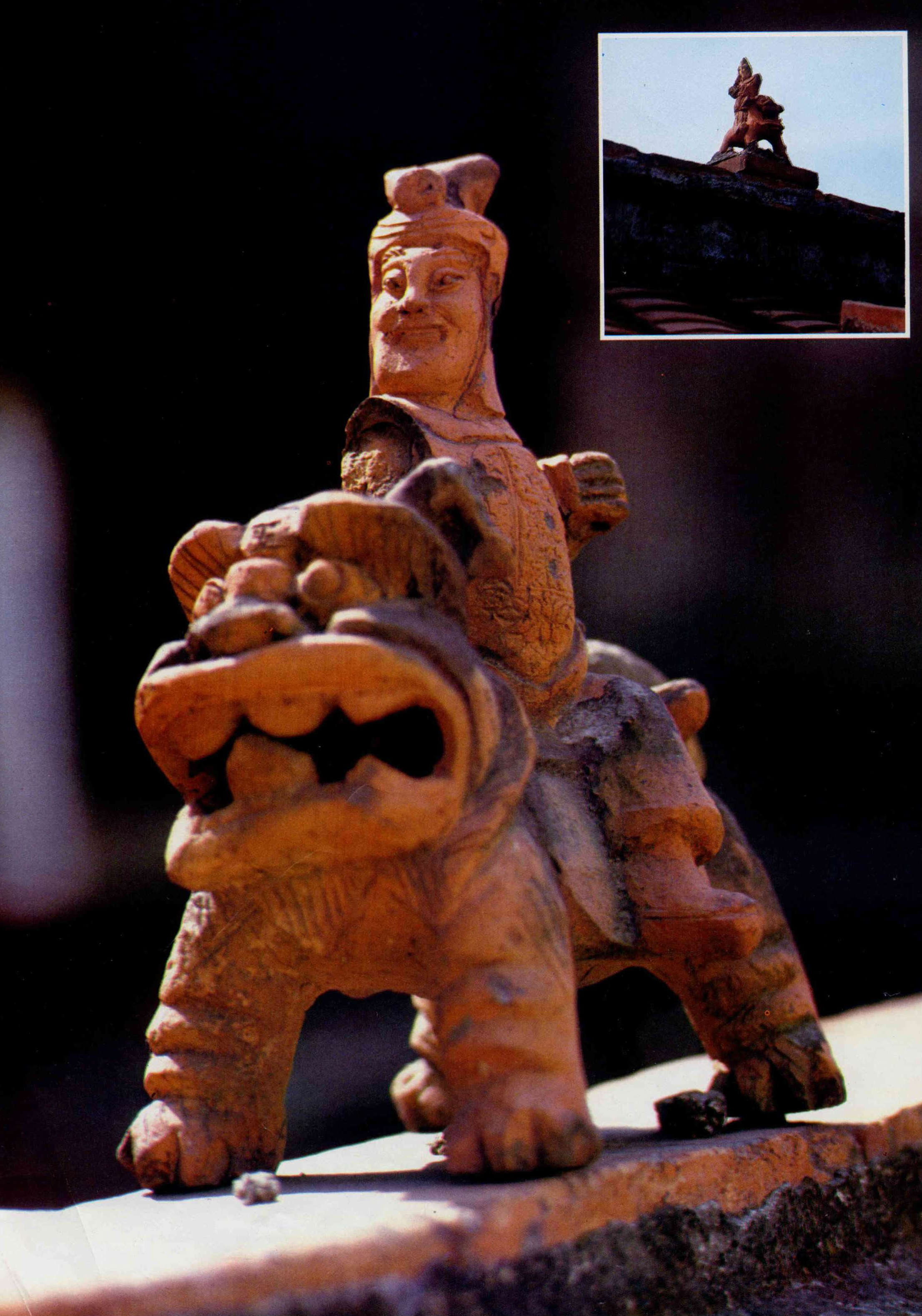 這種高踞屋脊上的武士塑像,據連雅堂先生在其遺著「台灣通史」卷二十三「風俗志」中的「宮室」這一部分裏記載說:「台灣屋脊之上,或立土偶,騎馬彎弓,狀甚威猛,是為蚩尤,謂可壓勝」。連氏的說法是否正確,尚待進一步的考證。連氏說土偶騎「馬」彎弓,但現存的塑像都騎獅子,並未發現有騎馬的。可能連氏誤以騎獅為騎馬了。