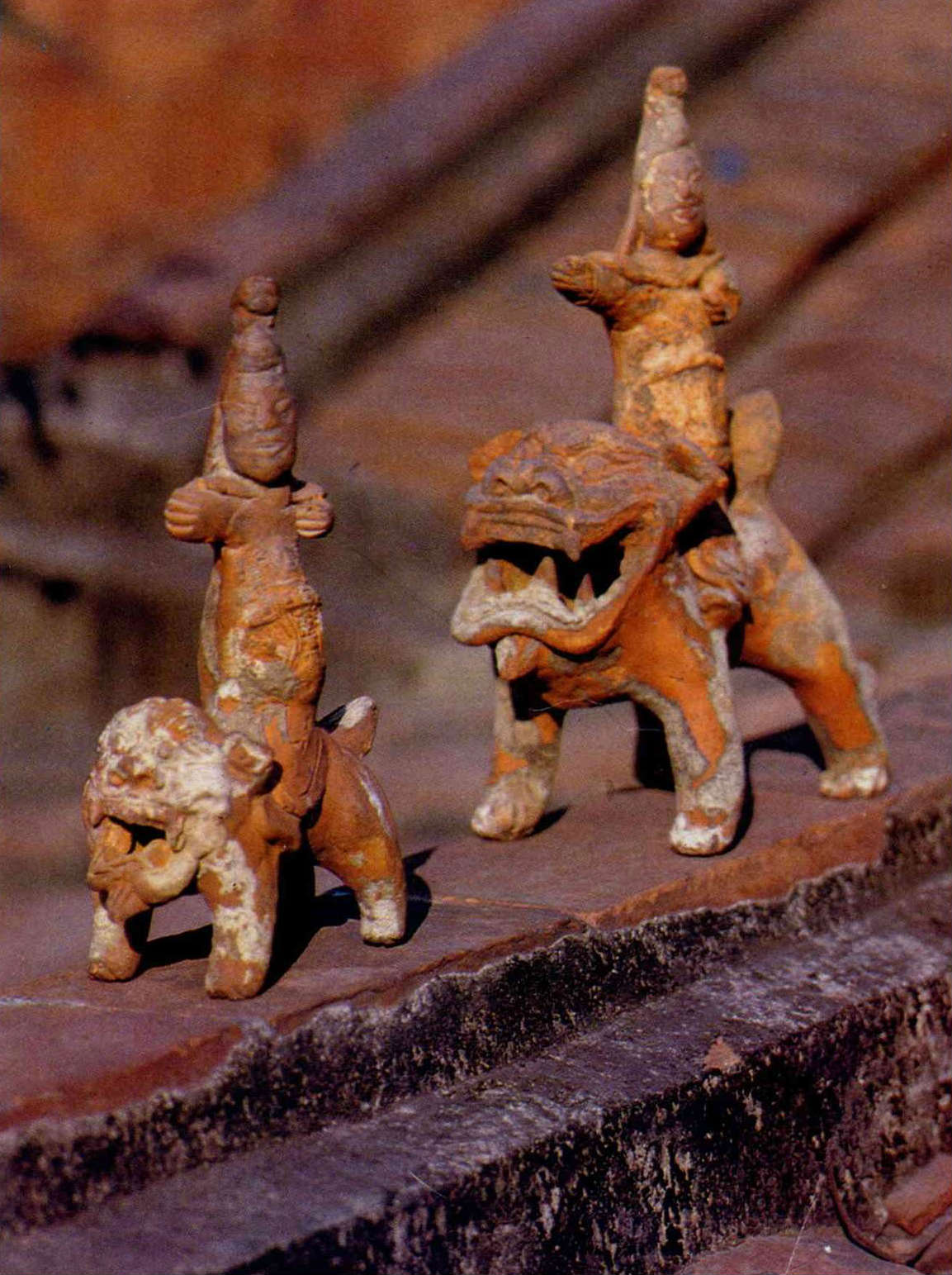 最近幾年來筆者分別從王吉成、劉三豪和陳明亮諸先生處,購得三尊甚為罕見的頭戴盔帽,身穿甲冑,騎獅彎弓,狀甚威猛的武士塑像。